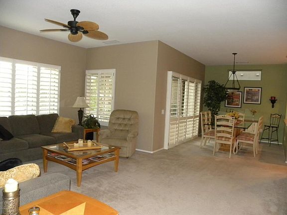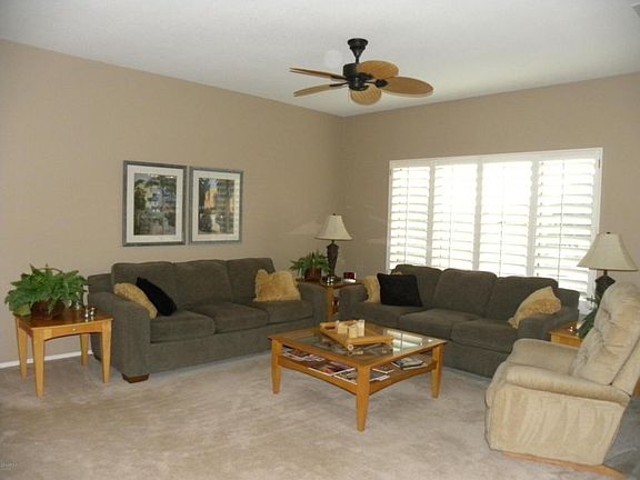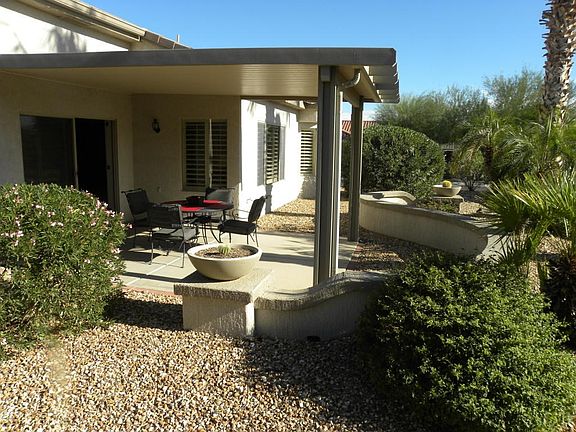 Very stylish Kiva model on interior large corner lot with mature landscaping and low voltage yard lighting in front and back yards. Extended 2 car garage. Extended covered patio with pony wall. Fully furnished. Tile, custom paint colors, plantation shutters, ceiling fans, indoor laundry, washer & dryer included. Watering system replaced with PVC in 2016. It's a must see home!