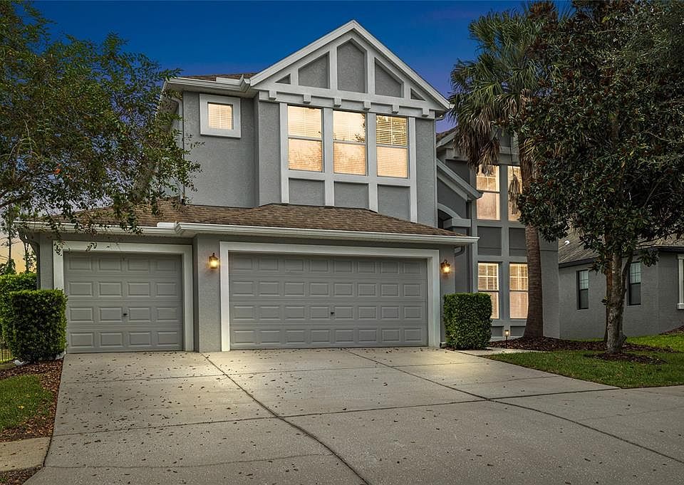 Welcome to Starling! Zoned for ALL A-RATED SCHOOLS! This stunning traditional style two-story home features 4 bedroom, 2.5 bathrooms, and a 3-car garage! Upon entry, you will be greeted with a grand foyer, which showcases SOARING CEILINGS, HARDWOOD FLOORS, AND AN ELEGANT STAIRCASE. The high ceilings give the home a very spacious open feel, with plenty of space for endless possibilities. The first floor has a formal dining room and living room combo, separate family room which opens to the kitchen, breakfast nook, and a private office with a nearby half bathroom. The kitchen has many appealing features which include a CENTER ISLAND, STONE COUNTERTOPS, TILED BACKSPLASH, NEW STAINLESS-STEEL APPLIANCES WITH A GAS COOKTOP, WHITE CABINETS WITH CROWN MOLDING, AND AMPLE PANTRY SPACE! Upstairs, are the bedrooms and remaining bathrooms as well as a HUGE BONUS ROOM! The primary suite features an OVERSIZED WALK-IN CLOSET and an ensuite bathroom which includes a DOUBLE SINK VANITY, GARDEN TUB, & SEPARATE TILED WALK-IN SHOWER! The backyard is FULLY FENCED and has plenty of yard space, along with a covered back porch for outdoor seating, grilling & dining, or lounging. *Kitchen appliances 2025, fence 2025, Exterior paint and gutters 2021, Water heater replaced approx. 2022* The FishHawk Ranch community is FILLED with scenic ponds and trails, resort style amenities, clubhouses, parks and playgrounds! Make this wonderful home your own! Call today to schedule a private viewing!