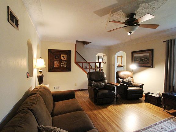 Cute as can be! This story and a half is packed with charm. This home features original hardwood floors in the living room as well as cove ceilings and arched doorways! A large picture window allows tons of light to flood the room, giving a cozy feel to this home. A nice, bright kitchen welcomes you with a stainless steel double sink, tiled back splash, loads of cabinetry and a pantry, as well as an eat-in nook help to make meal prep a breeze. The main level offers two bedrooms with original hardwood floors and both feature large windows that lookout over the landscaped yard. The relaxing bathroom is an oasis, with an updated tiled back splash and fixtures. The second floor boasts two more spacious bedrooms, one of which is the master, featuring ample storage and great views of mature trees and landscaped yard. Living continues outside in the private rear yard that features a great patio as well as a fire pit for relaxing. Act quickly!!