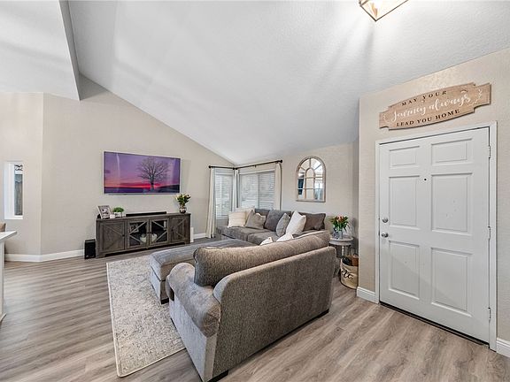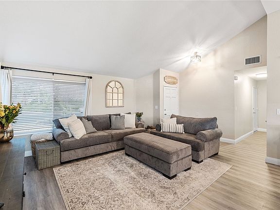 * LAKE VIEWS * SOLAR PANELS OWNED * No HOA & Low Tax * UPGRADED * A rare opportunity to own a single story meticulously UPGRADED home featuring a desirable open floor plan with lake views and the benefit of owned solar panels! The home opens into a welcoming oversized light filled great room that accommdates the upgraded kitchen, casual dining area & family room. You will appreciate the continuity of the engineered wood flooring that graces the entirety of the spacious great room. The kitchen is a gernerous size with plenty of cabinetry and features granite counters, stainless steel appliances, dishwasher, built in microwave, a large single basin sink and an oversized kitchen island with convienant barstool seating. The kitchen boasts a wall lined with pantry cabinets, providing ample storage space for all your needs. Enjoy the lake view from the comfort of your kitchen. Within this home you will find 3 spacious beautifully decorated bedrooms and 2 recently renovated bathrooms. The primary bedroom features a large picture window with a lake view, vaulted ceiling, walk in closet and a ceiling fan. Primary bathroom features an upgraded granite counter, upgraded faucet and light fixture. The remaining two bedrooms showcase distinctive wall accents, adding a touch of individuality and charm to each room. The hallway bathroom features a new vanity with stone counter, upgraded light fixture and renovated shower. Additional features of the home include upgraded double paned windows, upgraded light fixtures & ceiling fans and recently installed AC unit. Enjoy your morning coffee in the backyard while taking in the lake view. The backyard features artificial turf and a covered patio. The homes includes a spacious 2 car garage complete with epoxy floors and upgraded cabinet perfect for counter work space. This home is a must see!