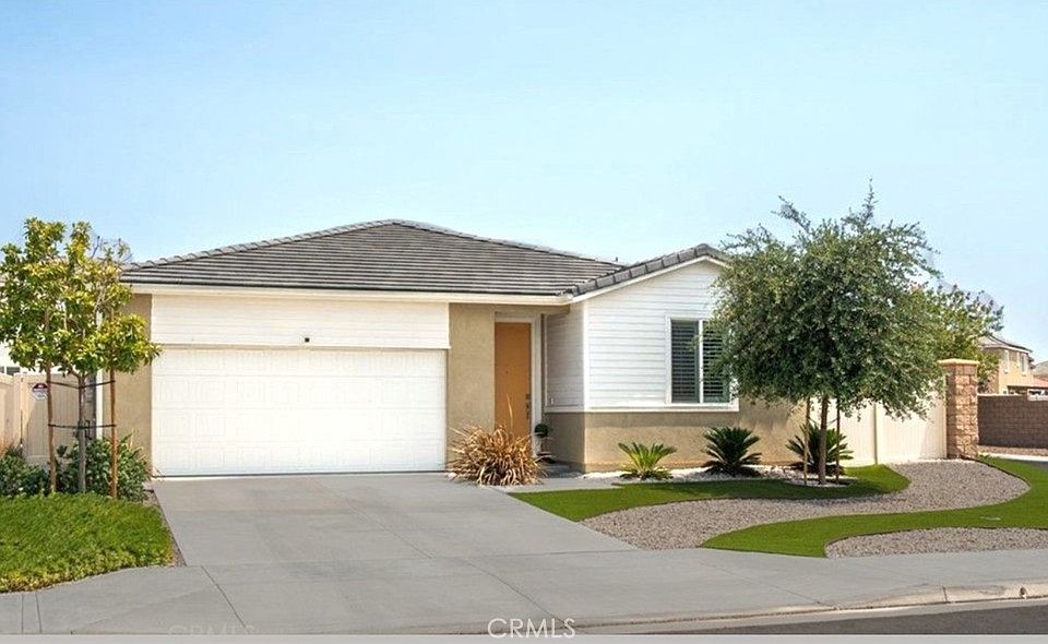 Step into this stunning, nearly new single-story home nestled on a desirable corner lot in the vibrant community of Moreno Valley. Featuring 4 bedrooms and 2 baths, and approximately 1,905 sq ft of living space. From the moment you enter, you’ll appreciate the open-concept layout, highlighted by recessed lighting and stylish track lighting in the dining area. The chef’s kitchen boasts a generous island, L-shaped custom cabinetry with white-washed glass doors, a walk-in pantry, and top-tier appliances. Retreat to the master suite, where you will find a spacious walk-in closet with custom built-ins, blackout blinds behind plantation shutters, and a ceiling fan create an inviting sanctuary. Both baths feature dual sinks and built-in heaters for a spa-like experience.
