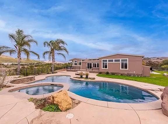 Luxury. Right on top of the hill, full views of the surrounding valley, and the lights of the 23 freeway at night. Breathtaking during sunset. Gorgeous Construction with a waterfall pool right besides it, it has a tropical feel to it, along with a "King of the world" vibe from the view. A list of perks are: No mosquitoes in the area, the weather is 15 degrees cooler than in the valley. Gated property. 2 car Garage. The Driveway fits 3 cars with no blocking, and 5 cars if you maneuver and block the exit. House is in a 10 acre land that has horse motel businesses operating inside it. The main gate is at the front of the property. A secondary private gate will be built for just the house. Renter pays for utilities, must be comfortable living in a horse ranch.