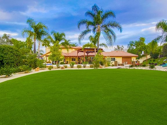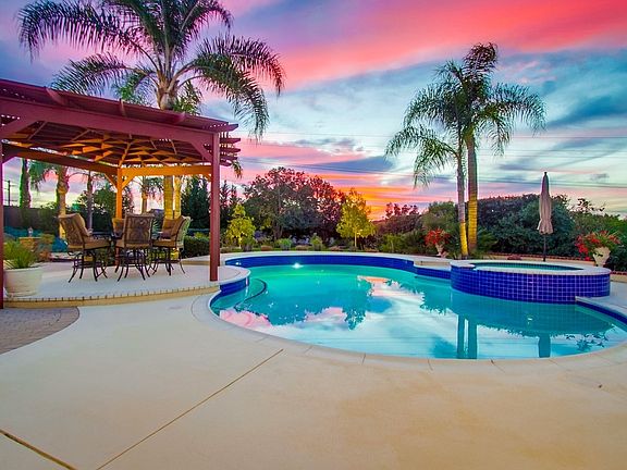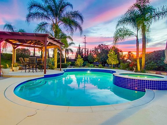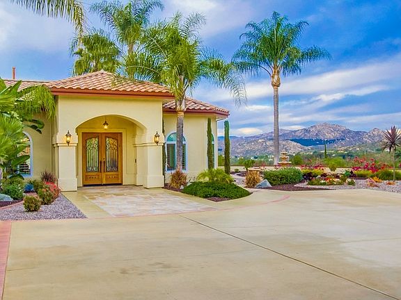 Situated in the exclusive Country Squire Estates, this beautifully upgraded home enjoys panoramic mountain views and sits on an acre of land. The property features a glistening pool, hot tub, built in BBQ, covered patio areas, 2 fire pits, a sport court, fruit trees and a large lushly landscaped lawn. The exquisite home features plantation shutters, upgraded kitchen with granite countertops & KitchenAid Architect Series II stainless steel appliances, and more! NO mello roos or HOA dues. Poway Schools!