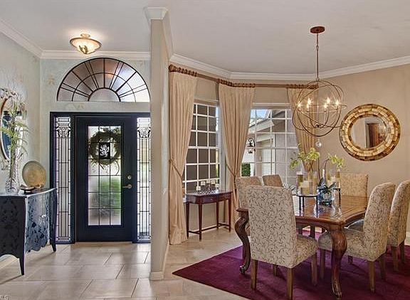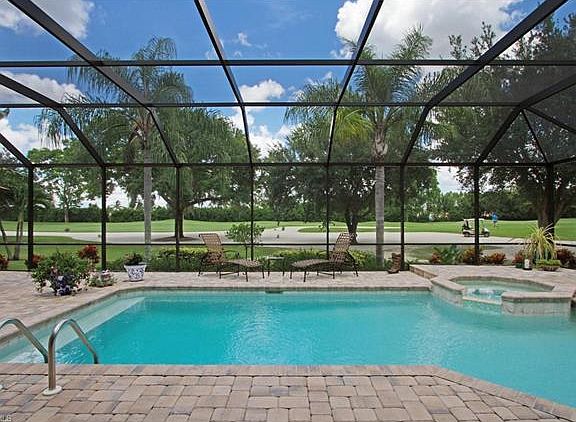 Fabulous view from this delightful home! This 3 bedroom, 3 1/2 bathroom plus den Fiddlesticks Country Club home has an open floor plan with a great flow, high ceilings, crown molding, 20-inch tile and wood flooring, a paver driveway with 3 car garage, a recently extended screened-in lanai with pavers, a heated pool and spa all controlled by an AquaLink system, and a full pool bath. Enjoy sunrises, sunsets, and a panoramic view of the 17th hole on the Wee Friendly golf course from the northern exposure lanai. From the moment you walk in the front door, you are greeted by the amazing view! The kitchen has granite countertops, stainless steel appliances, and is open to the family room and informal dining area. The master bedroom suite has "his" and "hers" closets and a lovely master bathroom. Conveniently located near shopping and dining, Fiddlesticks offers 2 championship golf courses, clubhouse with casual and formal dining, 8 Har Tru clay tennis courts, new 7,000 square foot fitness facility, new resort style zero-entry pool with cabana bar and pool-side dining. No CDD fee! Equity membership fee of $81,000 due to Fiddlesticks at closing ($64,800 is refunded when you sell).