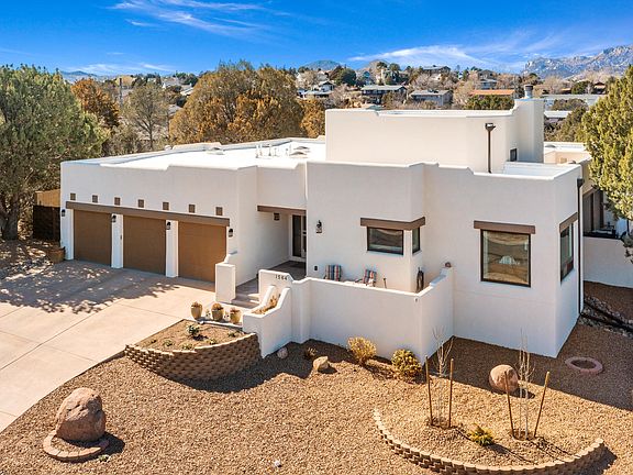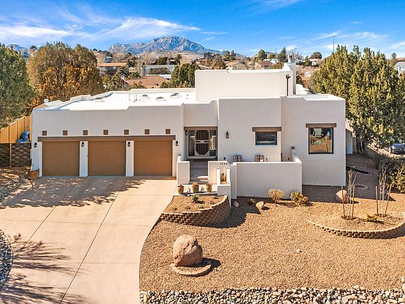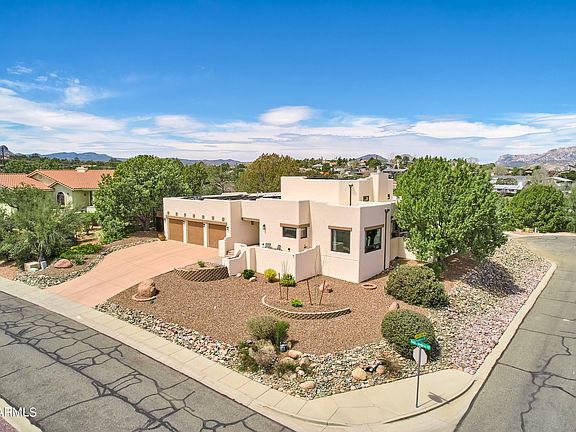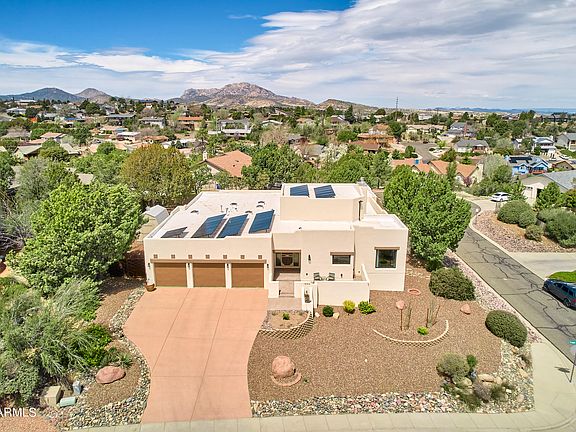 This beautiful Santa Fe-style home has been extensively upgraded and is located in the desirable Eagle Ridge neighborhood in the heart of Prescott. With stunning panoramic mountain views, a spacious fenced backyard, a rare 3-car garage, and no HOA, this home offers the perfect blend of luxury and convenience. Over $400k has been invested in upgrades, including new owned solar panels and equipment, making this home both luxurious and energy-efficient. The dramatic great room features a floor to ceiling stone-faced fireplace with a custom metal hearth, pine mantle, beamed ceiling and tile in-floor heating. The chef's kitchen is equally impressive, with high end appliances, custom cabinetry and granite slab counters. The primary suite features in-floor heating in the bathroom and a curbless shower, as well as two walk-in closets.