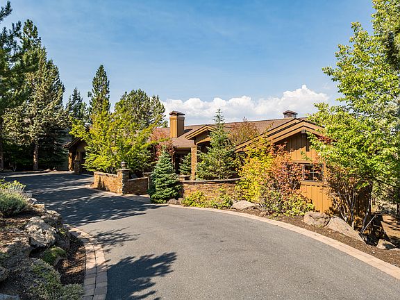 Nestled on a beautifully landscaped lot on one of Awbrey Butte's finest streets, this Mountain Modern home faces NW with panoramic views of the Cascade range. Covered patios on both levels maximize the views, visible from nearly every room. Enter through a gated stone courtyard with a water feature to a great room with vaulted ceilings, a floor-to-ceiling stone fireplace, and expansive windows that frame 180-degree mountain vistas. The gourmet kitchen features hickory floors, high-end Monogram appliances, a granite island, and Three Sisters views, while the dining area with wet bar opens to the deck for seamless indoor/outdoor living. In the primary suite, balcony access and sweeping views complement a soaking tub, heated bathroom floors, and a walk-in closet. Additional spaces include 3 guest bedrooms (2 en suites), a media room/home office with stone fireplace and courtyard access, a potential wine cellar, and a 3-car garage. Recently upgraded with new exterior paint and carpet.