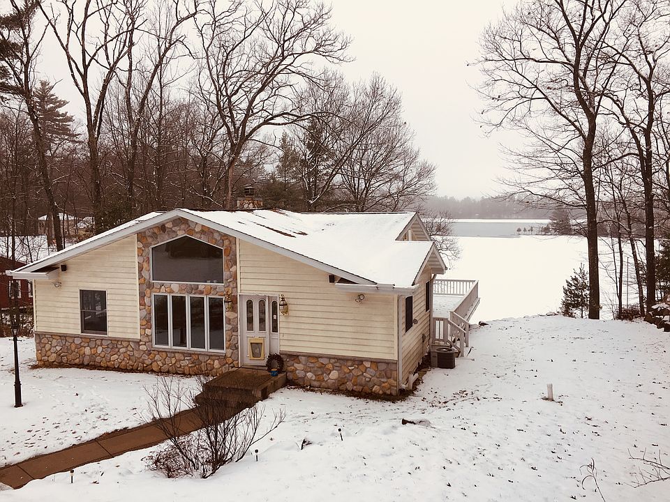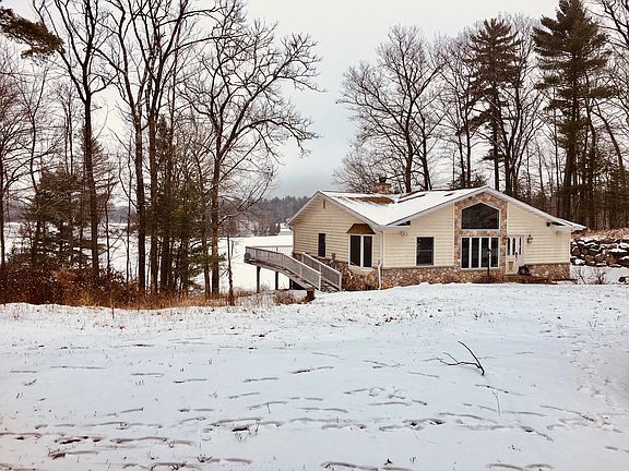 A tranquil waterfront home on 1.78 acres overlooking historic Bass Island. Bass Lake is part of the Spread Eagle Chain, and has nine attached lakes which can be traveled by speed boat or pontoon with great fishing. Property includes three docks with a remodeled boat house. The steps down to the lake are gradual. The beach is all sand with a gradual swim area. Inside of house is well insulated, with an open concept. Includes central air, natural gas forced air furnace and a 50 gallon electric hot water heater. Main Floor has a two sided gas fireplace. Lower also has a gas fireplace with a stone hearth, all glass windows with walk out basement to lake and patio. The garage is 40x60 all poured concrete with concrete siding. In floor heat, in work shop and guest quarters. Guest quarters overlook the lake and are open concept with separate bedroom and bath. Garage has a basement in lower under guest quarters. Heating is a large boiler. This was build in 2006. The yard facing the lake is tapered with rock. Newer septic with 1000 gallon concrete tank. Well was dug in 1996, water is excellent and has been tested as excellent. The landscape has a 50 foot large rock wall, with many rock landscapes and bushes.