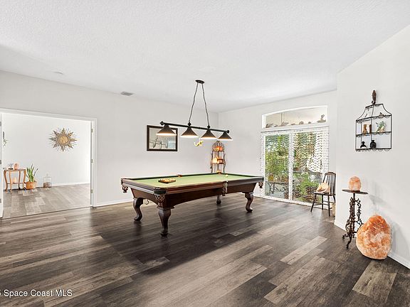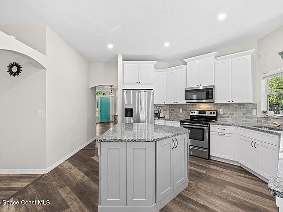 This home will not disappoint, showcasing 2,322 sq. ft. of living space, wide-plank oak flooring and trendy tile throughout, soaring high/vaulted ceilings, with abundant natural light. The stunning kitchen is the heart of the home, appointed with crisp white shaker cabinetry, a light gray contrasting center island, granite countertops, & stainless steel appliances to convey. Located near top-rated schools and just a 15-minute drive to the shores of Cocoa Beach, this home blends natural beauty & modern upgrades.