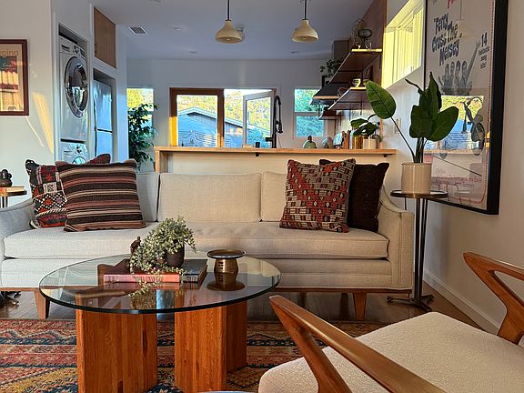 Inside, enjoy great natural light throughout, highlighting the home's warm, inviting atmosphere. The kitchen features a French door leading to a private brick patio, perfect for outdoor dining or quiet mornings with coffee. The Heath ceramic tiled bathroom adds a touch of artisanal craftsmanship, while the dishwasher, washer and dryer, and central HVAC bring contemporary convenience.