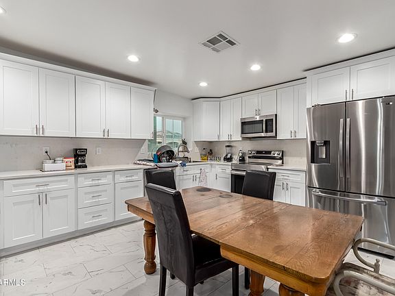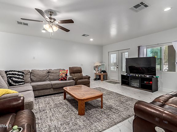 Distinctively renovated 6-bedroom, 4-bath home in Surprise exemplifies elegant modern living with upscale finishes throughout. Spacious open floor plans are flooded with natural light, complemented by new flooring and bright, airy interiors. Gourmet kitchens boast white cabinetry, quartz countertops and islands, stainless steel appliances, and expansive pantries for ample storage. Sitting on a generous lot with no HOA, this versatile residence offers future potential to convert into a duplex. The expansive backyard invites the addition of a pool or outdoor kitchen, perfect for entertaining. Enjoy the large covered porch, dual RV gates, and abundant parking. Conveniently located near community parks, the Surprise Regional Library, and numerous shopping options.