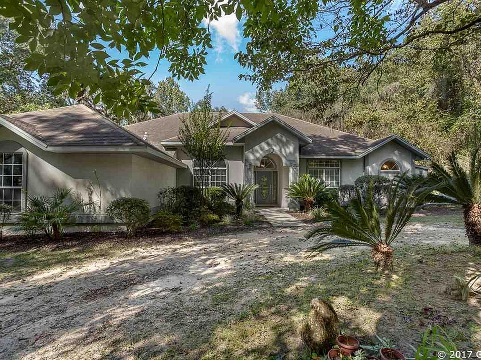 Private and Serene! Enjoy country living on 5+ acres in Alachua. This home offers all the upgrades you can ask for. The center island kitchen is equipped with double oven, granite counter tops, stainless steel appliances, walk-in pantry, and plenty of counter space. The home is warm and inviting with hand scraped wood floors, dining room, family room, and den with built in shelving and fireplace. Escape to your spacious owner's retreat with skylights, French doors leading to the screened lanai, luxury bath with his and her sinks, jacuzzi tub, and shower. Watch wildlife and enjoy the granddaddy oak trees from your screened lanai. All new low E windows in 2013 and fresh paint make this home move in ready.