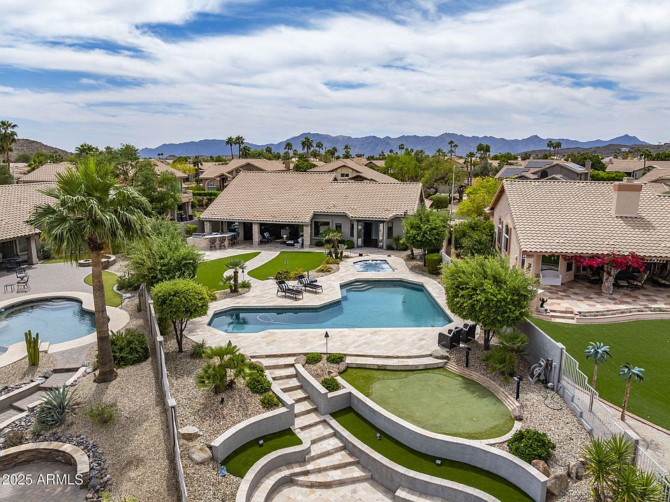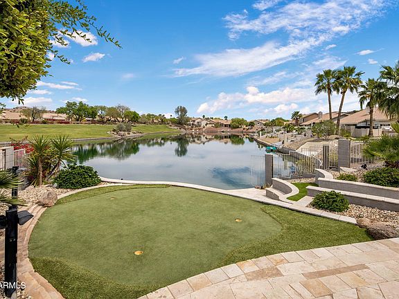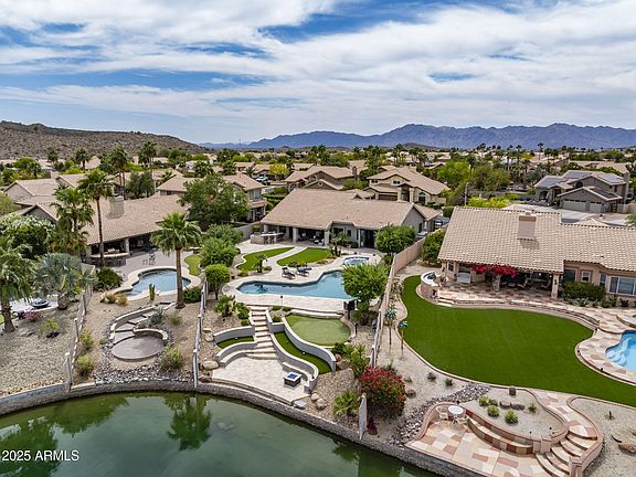 This fully remodeled 4-bedroom, 2-bathroom w/3 car garage executive home sits on a premium waterfront lot in the prestigious Foothills community of Canyon Springs. With 2,680 square feet of thoughtfully designed living space, this smart home is loaded with high-end upgrades and state-of-the-art technology throughout. Step inside to find an open-concept layout with vaulted ceilings, floor-to-ceiling multi-slide glass door, luxury vinyl flooring, 8' solid core doors, and a custom iron front entry equipped with an automatic roll down shade. The spacious great room offers breathtaking water views and flows seamlessly into the gourmet kitchen—featuring a Wolf steamer, electric cooktop, wine fridge, custom glass-front refrigerator, new dishwasher and designer cabinetry. The backyard is an entertainer's dream with a built-in BBQ, outdoor fridge, granite countertops, FOGCO misting system on patio and poolside, Sonos surround sound system, automatic patio shade, citrus trees, a sparkling lap pool, spa and putting greenall set against the backdrop of tranquil waterfront views. Experience immersive in-ceiling surround sound in the living room, master suite, and office, complemented by a fully integrated whole-home security camera system for enhanced comfort and confidence. Enjoy the ease of new pool pumps, spa heater, pool light, pool control board, water softener, and water heater all installed in 2023-2024. The resort-style primary suite includes an oversized soaking tub and a luxurious dual-head rain/steam shower with body jets and custom pebble tile. Generously sized guest bedrooms and updated bathroom with dual sinks, extra cabinets and counter space, tile framed oversized mirror and large tile walk-in shower with jets provides comfort for family or visitors. A flexible media room easily serves as an office, theater, or the 4th bedroom. Located in one of Ahwatukee's most sought-after communities with close proximity to beautiful Desert Foothills Park with a shaded playground and walking path. Enjoy the luxury of adding a private dock with a paddle boat with the ability to fish from your own backyard in a stocked lake. This home offers a rare opportunity for refined desert living in your very own private oasis.