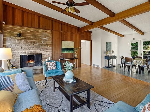 This is one of the coolest mid-century modern homes, beautifully refreshed on a large secluded lot, minutes from all the indie shops and restaurants in Old Burien! Features include a spacious living room with vaulted post-and-beam ceilings, massive sandstone fireplace, and filtered views of the Sound, open to a dining room with French doors leading to a large patio, a modern light-filled kitchen with new appliances and sunny breakfast nook, and eco-friendly bamboo floors plus Marmoleum floors in the kitchen and baths! There’s a huge private and tranquil front yard, and the high-ceilinged basement offers plenty of space for play, home offices, and a 2nd kitchen to make guests feel at home - with plenty of off-street parking for visitors!