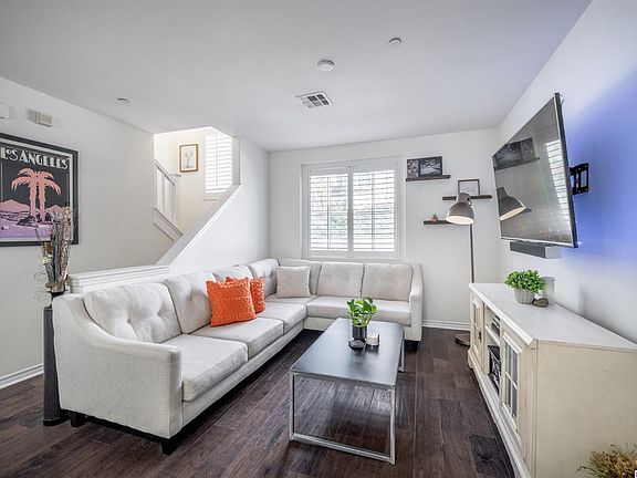 Beautiful Townhouse style condo located on gorgeous grounds that offer the most amazing views. As you enter the front door the first level can be used as an office or extra room with large closet and direct access to the 2 car attached garage. The 2nd level is the open floor plan with living room, dining area, center island/breakfast bar and kitchen, plus laundry room and the 1/2 bath. The upper level you will find the two primary bedrooms one with 3/4 bath and one with full bath. Amenities include new LG appliances, new interior paint, new flooring through out, recessed lighting, central heat/air, plantation shutters and lots of natural light. Complex amenities include a gated entrance, lots of guest parking, a community pool/spa, beautiful area for BBQ, walking path with views from one end to the next. Close to shops, restaurants, 405 and 5 freeways. Central to all.