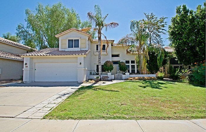 Gorgeous home in sought after Gilbert subdivision. Walk in to towering ceilings, beautiful tile and laminate flooring and plantation shutters. Large living room dining room combination. Spacious kitchen. Family room is surrounded by windows. Contemporary light fixtures throughout. Large master suite upstairs. Master bath boasts dual sinks, walk in closet and separate tub and shower. Upstairs bathroom also has dual sinks. Backyard is great with covered patio, grass play area and gated pool. A little TLC and this will be a perfect dream home. Do not miss this opportunity. Ask about grant program up to $15k!