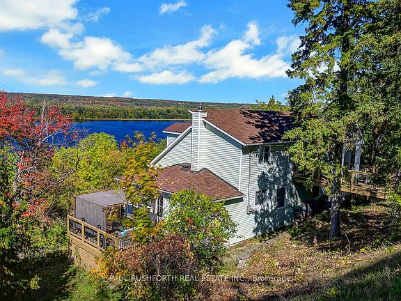 Absolutely one of a kind property on a 1.73 acre lot with unbelievable views of the Ottawa river and Gatineau hills. This unique home offers an open layout with a loads of function including a kitchen that offers lots of cabinet and counter space with a handy breakfast bar, quartz counters and stainless appliances overlooking the expansive living and dining room that can accommodate any sized table and features a gas fireplace, a sunroom with wood burning stove and incredible views, a family room, a den/library, a newly renovated full bath and laundry room. The upper level boasts three large bedrooms, a large foyer and a stunning brand new full bath with walk in glass shower, dual sinks with lighted/fog free mirrors and a giant soaker tub. With mostly hardwood throughout the house, brand new fridge, dishwasher and microwave, ultra quiet windows, fresh paint and new carpets and boasting a large deck on the east side and a deck with gazebo on the west side, two storage sheds, an oversized detached insulated and heated garage all on a huge private lot with a park nearby and just minutes to town this is one of those homes you just have to see to believe.
