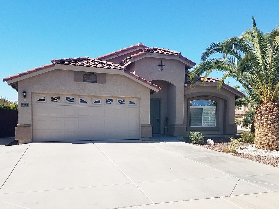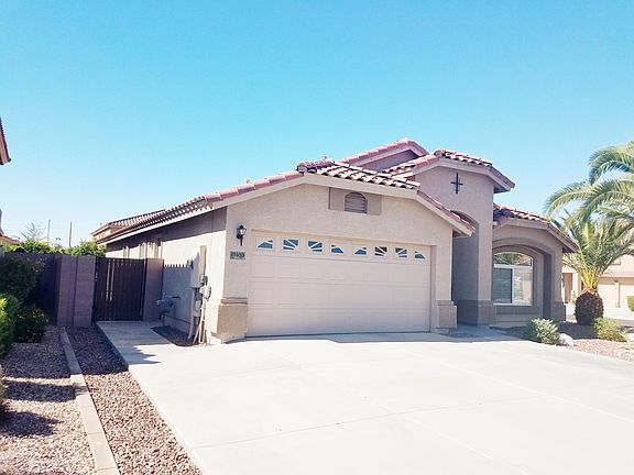 Sparkling clean house located on a premium corner lot with an extended driveway, move in ready, separate living room and family room, featuring 20'' tiles and laminate floors around the house, painted interior with neutral color. Kitchen is equipped with SS appliances, including refrigerator. The backyard has fruitful trees (like grapefruit, lemon, fig and orange) and it is partially paved. The garage is painted neutral color, it has heavy duty shelves and it is upgraded with epoxy flooring. Laundry room includes washer and dryer. The house is minutes away from shopping centers (such as Basha's, Walgreens, Walmart, etc), banking, great public and charter schools, restaurants, and freeway 303. Do not lose the opportunity to make this your new home!