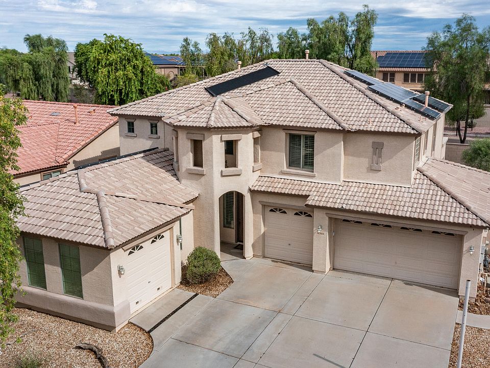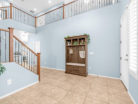 Spacious 2 story home offers 5 bedrooms, 3 full baths, and 3058 sq ft of flexible living space. The 4 car garage includes built-in cabinet storage & shelving. Step outside to your private play pool & expansive covered patio, perfect for relaxing or entertaining year-round. Throughout the inside, enjoy vaulted ceilings, updated modern light fixtures & ceiling fans as well as upgraded window shutters. A spacious living room opens to an entertainer's dream kitchen, with an open-concept layout that seamlessly flows into the living and dining areas. Kitchen is complete with granite countertops, built-in desk area, easy access pantry, kitchen island and an abundance of cabinet & countertop space. Perfect for entertaining family and friends in the oversized formal dining area. The upstairs prima The upstairs primary suite features ample room to unwind as well as dual walk-in closets & on-suite bathroom featuring an upgraded vanity with dual sinks and separate garden tub. Top level features the primary bedroom, 3 additional bedrooms and a full bathroom, as well as private loft and seating area perfect for growing families. Lower level features a bedroom and a full bathroom with easy access to the 1 car garage, perfect for guests or older family members. A water softener system adds comfort and convenience. Leased solar panels help reduce energy costs. This home is a perfect blend of space, style, and efficiency!