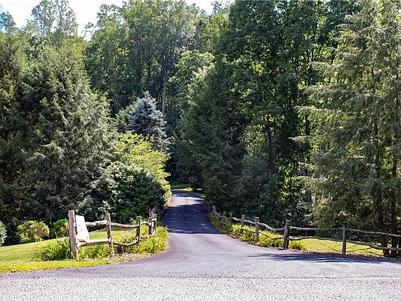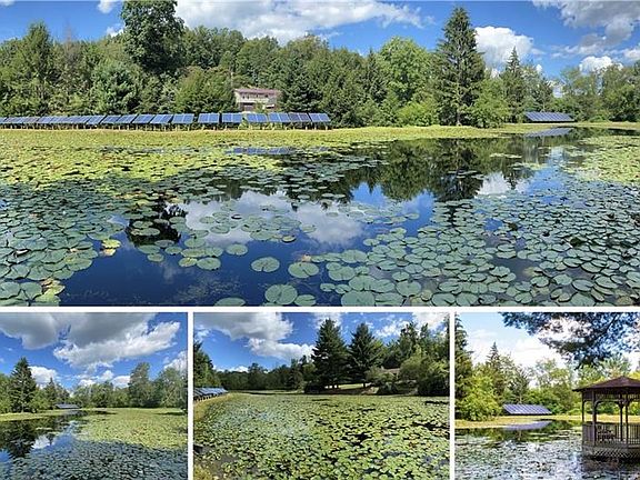 STAYCATION year round in this awesome 2800 square feet brick ranch nestled on 9.0 private acres w/a 1 acre pond. The split rail fence bordering the driveway leads you to this private nature's paradise! You'll enjoy relaxing on the 31X10 covered front porch w/an amazing tranquil view of the pond, gazebo & mature trees. The spring fed pond is 4-10ft in depth & is stocked w/fish. As you enter the double beveled glass front doors you will be in awe of the open floor plan w/amazing vaulted wood inlay ceilings, sunken family room w/hardwood floors, wood trim, crown molding & stunning stone fireplace. You'll enjoy preparing your favorite culinary treats in the spacious eat in kitchen w/an island & several pantries. The master en suite has an updated bath w/2 sep vanities, 8X8 walk in closet & 20X9 den w/a view of the pond(great area for an office or Pelleton).Plenty of space for your "toys" w/2- 3 car garages 28X40.The solar panels provide "free electric"for current 2 owners for house & cars.