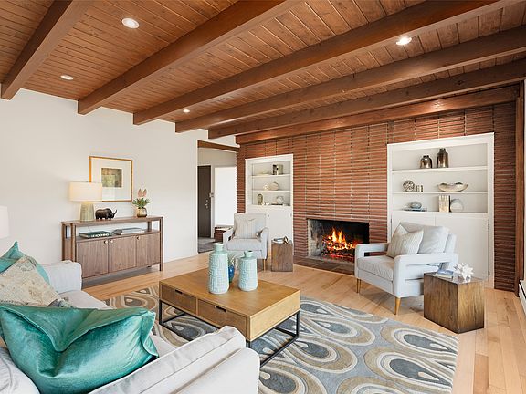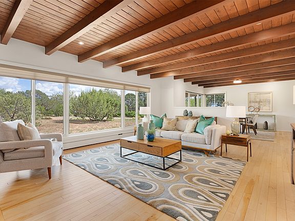 Set apart from the ordinary and just 2.5 miles from the Santa Fe Plaza, this striking custom Stamm home blends classic Northern New Mexico pitched-roof architecture with timeless Santa Fe charm. Sited on a generous 0.70-acre lot with expansive views of the foothills and Ortiz Mountains, this home offers a rare sense of space and privacy — all while keeping you close to the heart of town. Thoughtfully renovated throughout, the main residence features three bedrooms, wood floors, and a warm, wood-plank ceiling with exposed beams. The living room centers around a charming brick fireplace flanked by custom bookcases, and the stylish kitchen boasts cool glass tile backsplash, great gas cook top, ample storage, and even a wood burning fireplace for ambiance. The sunlit primary suite includes California Closets and a beautifully modern bath with a large walk-in shower. A fully operational photovoltaic solar system helps keep energy costs low. A standout feature of the property is the detached 750-square-foot studio — complete with its own 100-amp service, ¾ bath, soaring ceilings, custom wrought iron doors, and an upstairs loft (not included in the listed square footage). Whether you're an artist, entrepreneur, or simply seeking bonus flex space, this studio delivers. Recent improvements include a Propanel roof, new Anderson windows, high efficiency tankless water heater, remodeled bathrooms, new tile and wood flooring, updated kitchen countertops (2024), all-new interior lighting (2023), and fresh paint throughout (2025). This is a one-of-a-kind offering that feels private and peaceful — yet is mere minutes from galleries, dining, and all the cultural vibrancy of downtown Santa Fe.