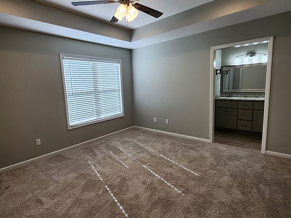 Tucked away for privacy, the primary suite is a spacious retreat with soft carpet underfoot, a tray ceiling that adds architectural interest, recessed lighting, and a ceiling fan for added comfort. The attached primary bathroom includes a double-sink vanity, a shower/tub combination, and a large walk-in closet that provides ample room for personal storage.