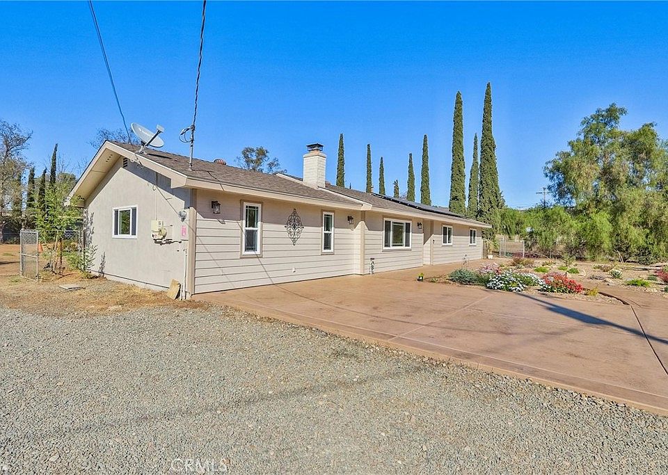 Step outside to an expansive fully fenced backyard featuring a metal shed, a 10x14 foot slab ready for a shop/or shed, a covered patio with misters, stamped concrete, and a propane firepit—ideal for entertaining. The yard also has two drive through 12 foot gates. The front of the home boasts a large 6-inch steel-reinforced, colored, and stamped concrete driveway with sidewalks and newly installed waterwise landscaping. Additional highlights include a newer roof with transferable warranty, paid solar, RV parking with a 50 Amp panel, an owned propane tank, a backyard sprinkler system, as well as front and backyard drip irrigation all on timers. There is a view of the hills from the front of the home, and the location could not be more ideal as it is located on a private quiet road.