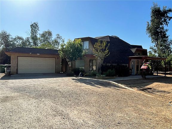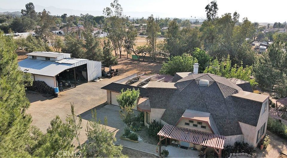 This custom geodesic home and large (40’x45’) barn sit on a 1.25-acre horse property. Set back from the street, the long driveway cuts through a forest of pine trees leading to the house and barn. The unique, geodesic house was built in 1978 by the current, original owners. They still have the plans for the home. Gardens and pathways surround the home with unique plants and herbs and a lovely sitting area on the back patio. The back portion of the lot is open with room for a horse corral or training area. As you enter the home, the open dome shape envelops you. The living room ceilings are created by the octagonal panels of the building. The open plan of the first floor forms a loop that brings you through the dining room, to the kitchen, into the laundry room and main bathroom, and through the main bedroom. All of the downstairs areas are light with high ceilings. The kitchen is all-electric with a center island and plenty of space to prepare and cook meals. There is a breakfast room with windows that face the lovely back porch and yard. The second floor is built into the back half of the dome. There are three bedrooms and one bathroom on the second story. The upstairs hallway is open to the living room below. The barn is large enough to provide covered parking for an RV but also has 3 built-in horse stalls (currently used for storage), and a chicken coop. There is storage space on a second level in the center of the barn building. The property has rights to well water through a well agreement with the adjacent property and is also connected to public water through WMWD. Your landscaping can be watered using the well water, saving you money on your utilities. There is a solar system that was installed in the 1970s, it does work, but may not be as efficient as a newer system would be. While you may feel like you are out in the country, this home is very convenient for local shopping and transportation. Don’t miss out on this wonderful rural paradise.