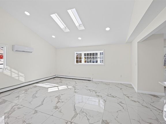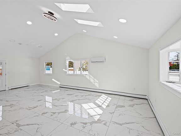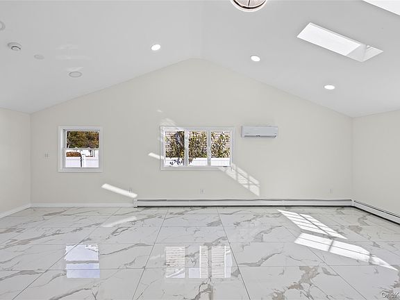Recessed lightingSky lightsStainless steel appliancesHuge marble style tileLots of new windowsCathedral ceilingsWhite quartz countertops