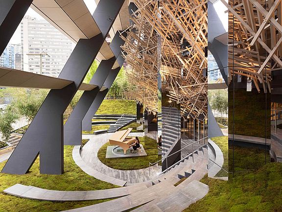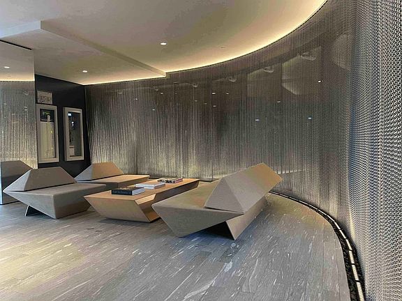 Serene japanese garden terracesFull-height windowsCurved wood wallsIntegrated miele appliancesTravertine spa bathrooms