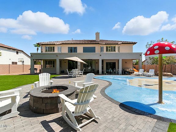 Discover luxury and comfort in this stunning 6-bed, 3.5-bath home in the gated Symphony 2 community of Chandler. Featuring over 4,600 sq ft, this home offers a bright chef's kitchen with granite counters, gas cooktop, and island, plus formal living and dining rooms ideal for entertaining. The primary suite opens to the patio and boasts a spa-style bath with soaking tub and walk-in closet. Step outside to your own private resort—a backyard transformed by a $150,000 upgrade, featuring a fire pit, lush lawn, and a one-of-a-kind splash pad for endless family fun. With a 3-car garage, RV gate, and park across the street, this home blends elegance, recreation, and prime location near top schools, shopping, and dining.