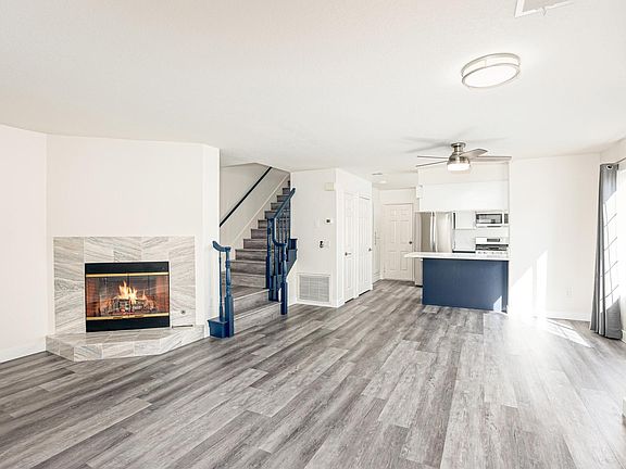 PLUSH and completely remodeled with modern colors and finishes. It's a 3BR, 2.5BA, 1650sf Two story Townhome. Kitchen has all new, high end LG stainless steel appliances. Unit is bright and airy with a private balcony and two gas fireplaces. All bedrooms are on the second floor. Master suite comes with soaking tub, separate alcove shower, 2 sinks, 2 closets, fireplace and vaulted ceiling. The other two bedrooms share a full bathroom. Two parking spaces (a private garage with door opener that is accessible from inside the unit, plus one parking behind it). First floor consists of a Large Family room with Fireplace, a Dining area, a Guest Bathroom, Guest Closet, a Laundry closet furnished with a GE stacked washer & dryer, and a kitchen with a lot of cabinets.