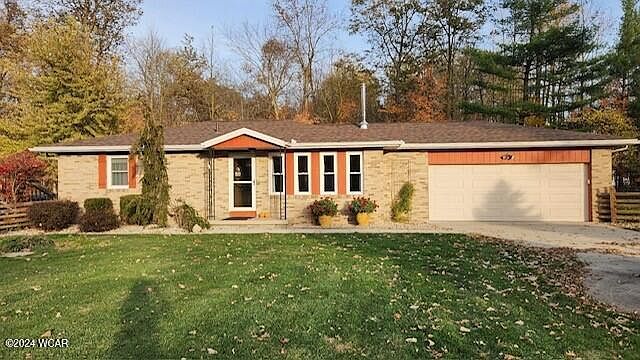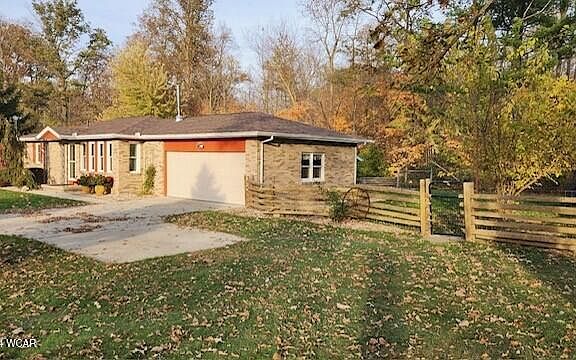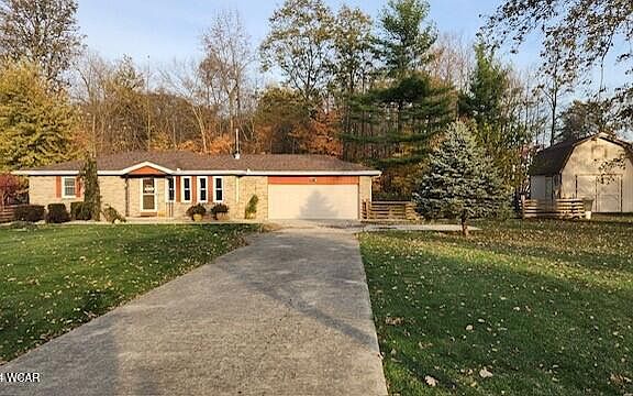 This 2 bedroom 1.5 bath brick ranch is so well kept inside and out! Many updates: windows and roof 2 years, sump pump 2024, garage door and opener 4 yrs, full bath 2 yrs, H2O heater 4 Yrs, solid wood trim and solid wood interior doors. wood cast iron stove, Aqua lock veneer hardwood flooring, fenced yard, above ground pool, liner 4 yrs, deck, 3 season room 10x18 windows added 7 yrs, refrigerator 4 yrs, situated on a beautiful wooded lot. Wapakoneta bus also picks up.