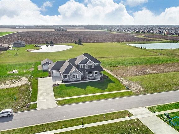 Experience the serenity of a country setting in the new Hickory Lake Development This custom home features a refreshing light interior with large windows, white woodwork, gray walls and luxury vinyl plank flooring. First floor master bedroom suite. 2-story great room showcases a stone fireplace with built-ins. Large eat-in kitchen with custom cabinets and a 9 ft. island. Office for working from home Covered deck and stamped concrete patio with a fire pit overlook the farm fields in the distance. Oversized 3-car garage offers room for a workshop. 12' x 24' extra building