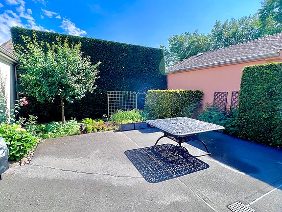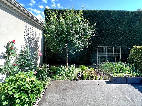 Backyard oasis offers a custom built-in Gas BBQ Grill, outdoor seating area, garden area, fruit tree.