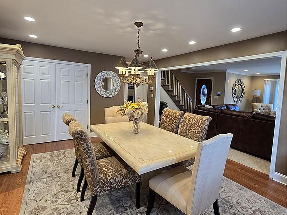 The main level features a sophisticated formal living room flooded with natural light from oversized picture windows, accented by graceful mouldings and tasteful finishes. The elegant dining room provides an ideal setting for hosting, while the tremendous eat-in kitchen delivers both scale and style- complete with a substantial center island that doubles as dining seating, stainless steel appliances, abundant cabinetry, and a charming coffee/serving nook.