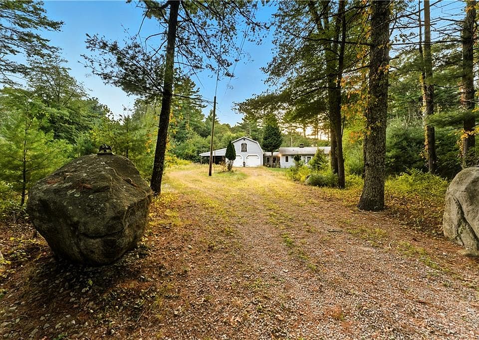 Discover the potential of this rustic ranch home tucked away on a tranquil approximately 3-acre wooded lot in scenic Charlestown with 1076 sq ft of living space on the main level and additional 874 sq ft above the 2-car garage, this unique property offers room to grow, relax or create your own retreat. Step inside to an open-concept living area featuring hardwood plank floors, exposed wood ceiling and a wood stove that adds cozy charm. The living space flows into the living room & dining area onto a deck overlooking the private backyard, perfect for quiet mornings or evening gatherings. The main home offers 2 bedrooms including a master bedroom with a bathroom. Above the garage you will find a bonus living space with a bedroom and full bathroom ideal for guests. The 2 car garage has ample storage along with a wood stove and a generator and hookup for the house. Outside, the wooded lot features a small pond with a waterfall, a storage shed and plenty of open space for pets, gardens or even horses. Nature lovers and outdoor enthusiasts will appreciate. This home is being sold as is, furnished and is priced accordingly for buyers to bring their vision and a little TLC to make it their own. Cash only buyers. Convenient location to highways, beaches..Low Taxes