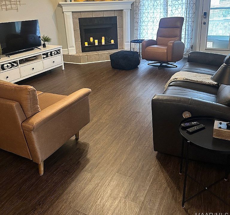 The open living area is filled with natural light and highlighted by a corner fireplace, creating a warm and inviting atmosphere. The home features luxury vinyl plank (LVP) flooring throughout and is finished with light, neutral paint tones, providing a clean, modern feel.