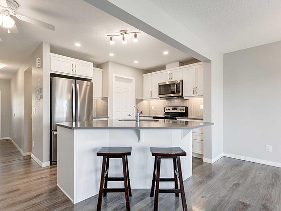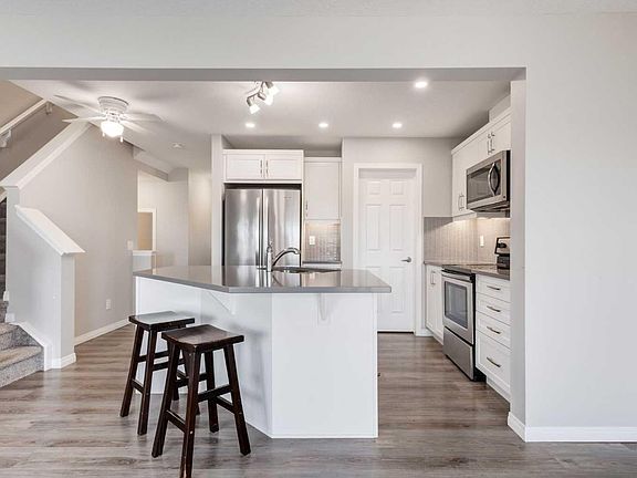Welcome to 157 Hillcrest Square SW - a bright and modern 3-bedroom, 3.5-bathroom townhome featuring a fully finished walk-out basement, a private fenced southwest-facing backyard, and best of all, no condo fees! With nearly 2,000 sq. ft. of developed living space and a single attached garage, this property offers incredible value for first-time buyers, families, or downsizers looking for comfort and convenience in a fantastic neighbourhood. From the moment you step inside, you'll appreciate the thoughtful design and open layout. The kitchen is stylish and functional with stainless steel appliances, quartz countertops, a central island with stool seating, and a generous walk-in pantry. The adjoining dining and living rooms are flooded with natural light and provide direct access to a sunny balcony - a perfect spot for BBQs or an evening glass of wine. A tucked-away 2-piece bathroom completes the main floor. Upstairs, you'll find three spacious bedrooms. The primary suite features a large walk-in closet and a spa-like ensuite with walk-in shower and oversized vanity offering excellent storage. Bedrooms two and three are bright, well-proportioned, and share a 4-piece bathroom with yet another large vanity and plenty of storage. Convenient upstairs laundry completes this level, adding to the home's smart functionality. The walk-out basement expands your living space with a large and sunny recreation room - perfect for family movie nights, kids' play space, or game-day gatherings. Sliding glass doors open directly onto your private backyard, which is fenced and offers gated access to a walking path and natural green space. A 3-piece bathroom, mechanical room, and an impressive 150 sq. ft. storage room complete this level. Located in the sought-after Hillcrest community, this home offers unbeatable convenience. Parks, schools, shopping, and green spaces are just steps away, while quick access to major commuter routes makes getting around easy. With its spacious layout, modern finishes, walk-out basement, and no condo fees, this is the opportunity you've been waiting for!