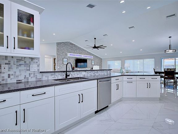 Move in ready, luxury, waterfront pool home. Pride of ownership shines throughout this immaculate 3 bedroom, 2 bath residence with upgrades and finishes that are truly better than new. The home offers the perfect blend of elegance and comfort with an open split floor plan designed for both relaxation and entertaining. The gourmet kitchen features sleek quartz counter tops, white designer 2'x4' tile flooring flows seamlessly throughout the main living area and luxury vinyl plank in the bedrooms, creating a sophisticated atmosphere. The luxury master suite is a true retreat, boasting a spa inspired bath with premium finishes. Step outside to your private backyard oasis, complete with a 32X12 salt water, heated pool, and built in hot tub. all under a 57' X 25' pool cage Perfect for year-round enjoyment. A whole house generator with 3, 120 gal, owned LP tanks, provides peace of mind.