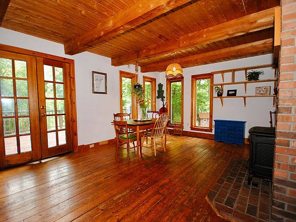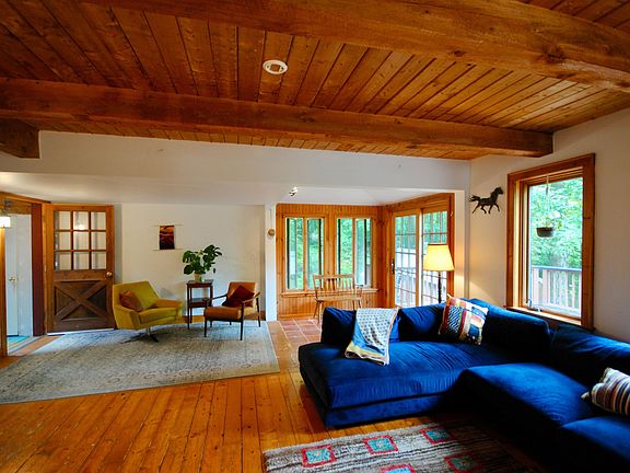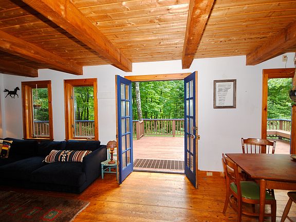 Lovely country Saltbox style home with open concept living located a couple minutes south of the village of Wilmington. Sited back from the private road, this home has established gardens and landscaped grounds on over 10 acres with lawn space and trails through the woods. The interior offers an updated kitchen with granite countertops and stainless appliances and beamed ceilings There is gorgeous wood flooring and a wall of windows for beautiful light in the main living/dining space with French doors that lead to an expansive deck overlooking the back yard. Small bath with a clawfoot tub on the main floor along with storage workroom and laundry.  Primary bedroom has an attached sunny small room that is perfect as a home office or library. Two other bedrooms on second floor and shared main bath with custom updates. Third floor provides additional finished space/bonus room, plus unfinished attic storage space. Lots of parking space and room to roam. Exterior paint completed summer of 2022. Located close to Wilmington and local ski areas.  This is a great find for your Vermont country retreat!