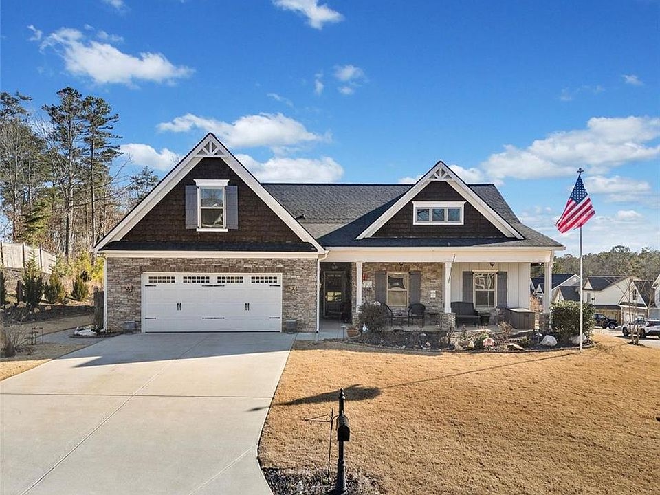 Welcome home to this beautiful Craftsman-inspired stepless ranch nestled in one of Ball Ground’s highly sought-after neighborhoods just minutes from Historic Downtown Ball Ground and I-575. The front of the home will welcome you in with its covered front porch ready for rocking chairs and your beautiful potted plants. As you enter, you'll immediately be greeted by the rich, dark hand-scraped hardwood floors that flow effortlessly through the main living areas and the owner's suite. The spacious layout offers plenty of room and flexibility for a variety of furniture arrangements. Prepare to be amazed by the upgraded kitchen—perfect for those who love to entertain! The custom off-white cabinetry with under-cabinet lighting provides a sophisticated touch, while three ovens—**yes, three**—ensure you’re ready to cook for a crowd. Featuring two electric wall ovens, a gas range, stainless steel appliances, granite countertops, a breakfast bar, and a pantry, this kitchen truly has it all. Bonus: an Instahot water dispenser adds an extra layer of convenience for busy days. The owner's suite features not one but *two* walk-in closets and an ensuite bathroom with a large, tiled, frameless walk-in shower, dual vanity and water closet. Two generously-sized secondary bedrooms each offer spacious closets and share an oversized secondary bathroom. A spacious laundry room with cabinetry, storage closet and a custom-built wall-mounted folding table rounds out the main level of the home. Venture upstairs to discover a private bedroom and bathroom, ideal for a teen suite, in-law suite, or guest retreat. Step outside to a professionally designed and installed extended patio with an outdoor kitchen and pergola, creating the ultimate outdoor living space. The outdoor kitchen features a built-in Blaze gas grill, griddle, stainless steel refrigerator, stainless storage drawers and trash bin. The covered patio, outfitted with ceiling fans and 110v outlets for outdoor heaters or string lights, ensures year-round comfort and ambiance. For those who need extra space, the 12x24 storage shed with a metal roof and electricity is perfect for additional storage or a workshop. The oversized two-car garage includes a workbench, storage racks, cabinetry, and 20-amp service, offering ample room for vehicles, hobbies, and all your storage needs. The exterior of the home comes to life in spring with lush landscaping, flowering bushes and trees. The six-zone irrigation system ensures your lawn stays vibrant, while the custom landscape lighting adds a gorgeous ambiance to the home’s exterior in the evening. Security cameras are installed for peace of mind. Schedule your tour today!