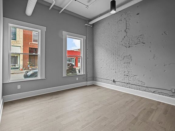 Urban loft livingOpen floor planEnormous windowsDouble vanity bathroomNew hardwood floorsExposed freshly painted brick