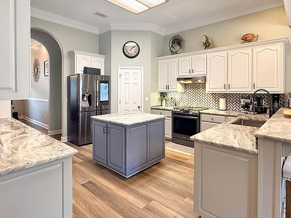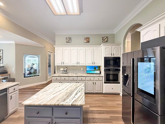 The reviews are in! Super kitchen! Wow that is a hugh triple garage! Stunning home on a large lot with 11-ft ceilings, crown moulding, and trey ceilings throughout. Features 3 bedrooms plus a flex room, spacious living area with built-ins and gas fireplace, and a large Florida room. Expansive backyard is pool-ready. The master suite offers dual custom closets, separate vanities, walk-in shower, and oversized jetted tub. Kitchen has ample cabinets, and the dining area fits a large hutch and buffet. Guest powder room adds convenience. The 3-car garage is a showstopper with epoxy floors, utility sink, and storage. A perfect blend of comfort and style! Hurry and make this home yours today!! The Kitchen Appliances are only 3 years old, double wall oven. Along with a newer hybrid gas hot water heater.