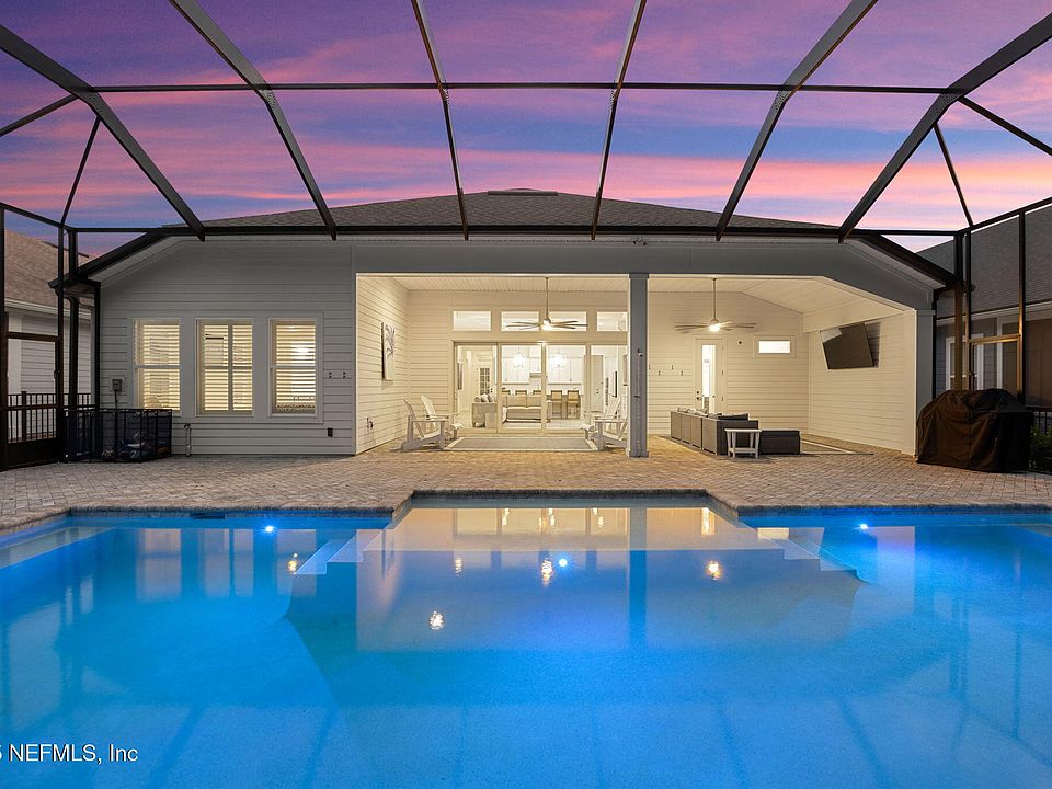 Inside, enjoy a custom entertainment wall built in to the ceiling with accent lighting, a dreamy laundry room with built-ins, and a split floor plan featuring 4 bedrooms, a private office, and a spa-style owner's retreat with large walk-in closet. The 3-car tandem garage includes a side yard door and discreet trash can enclosure. Zoned for top-rated St. Johns County schools and located in the golf cart-friendly community of Nocatee, just minutes to beaches, shopping, dining, and parks.