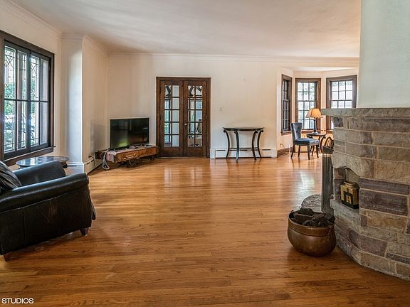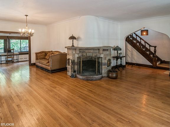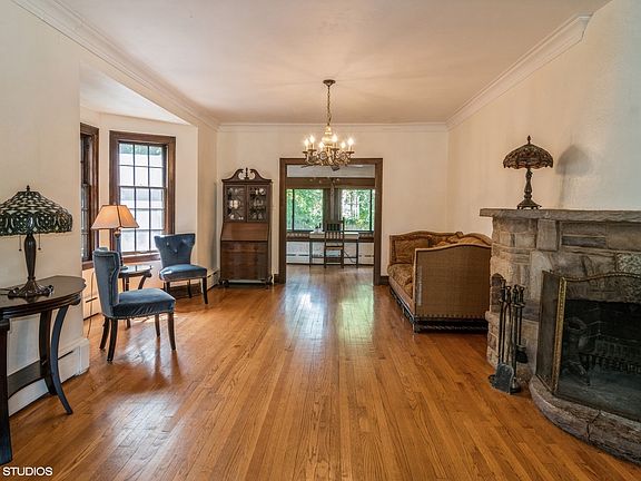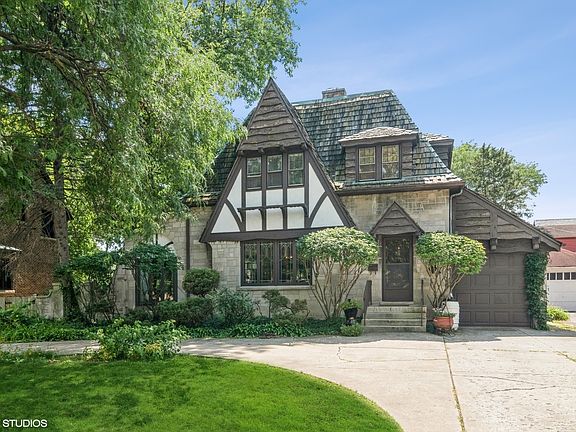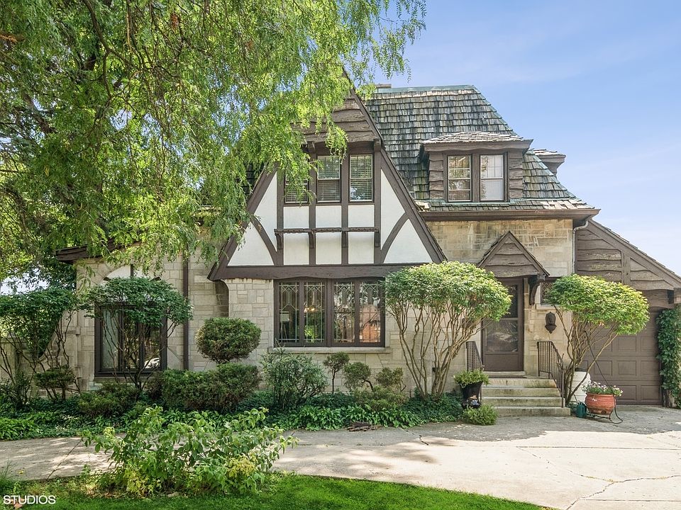 This Greystone Tudor, orignially the Hugo Reich residence (a local builder), is quintessential Riverside, bursting with historical charm. Located in a prime location near the elementary school and parks, the house sits back off the street with fantastic curb appeal and circular drive. Inside, it features wonderful original woodwork and fixtures, french doors and arched doorways. The spacious first floor features an open floor plan filled with natural light that brings the sunshine through the beautiful and large windows. The living and dining room are anchored by a unique angled stone fireplace and lead to a lovely den and sitting room. The foyer leads into a renovated kitchen with high end appliances, large eating space that looks out a wall of windows to the backyard and a large updated powder room. The second floor has 3 bedrooms and a classic renovated full bath. The top floor has a bonus room that can be used as a 4th bedroom, family room or office space. There is additional living space in the walk out basement that includes a rec room with original bar and woodwork as well as tons of space for storage and woodworking and laundry. The low maintenance yard is fully fenced and private with a deck and fun tree house for the kids. The house has been well maintained and has a newer water heater and both boiler and heat/AC from Mitsubishi split units. Riverside is a historic landmark, designed by Fredrick Law Olmsted. It is a family and commuter's dream with top ranked schools K-12 and located on the Burlington Northern Metra train line and is a quick trip to the city. You won't find a better place to live!