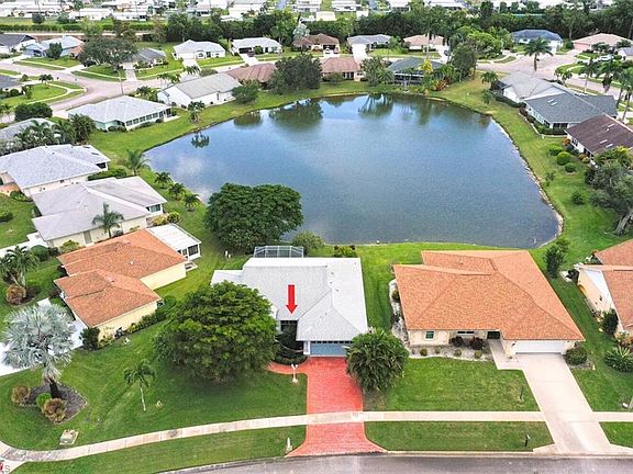 This beautiful home features an AMAZING WATER VIEW that will impress any guest the moment they walk through the door! The open floor plan, 21’ x 12’ screened-in patio, and wide sliding glass doors are all designed to take full advantage of the gorgeous lake view. The home is being sold TURNKEY with elegant decor. There are cathedral ceilings and tile on the diagonal in the main living areas. The oversized kitchen features custom tile work and plenty of cabinet space. There are walk-in showers in both the Master BA and Guest BA. The plumbing throughout the home has been upgraded. Just some of the other nice touches include crown molding, frosted glass etchings at the entryway and on the lanai, plantation shutters, solar tube, and laundry room. The large two-car garage has built-in shelving for additional storage, plus a utility sink. The master suite has a nice walk-in closet. One of the guest bedrooms has a Murphy bed, so it can easily double as a home office. Riviera Golf Estates has one of the lowest HOA fees in Naples: $144/mo. (includes internet). The community amenities are excellent: a heated saltwater pool with lap lanes, tennis/pickleball/bocce/shuffleboard courts, exercise room, billiards room, and a huge clubhouse with lots of fun activities for all to enjoy. This quiet and friendly 55+ community is only 8 miles from the beach and just a ten-minute drive from the shops on 5th Ave. This is one of the nicest homes in Riviera Golf Estates. Paradise awaits you!