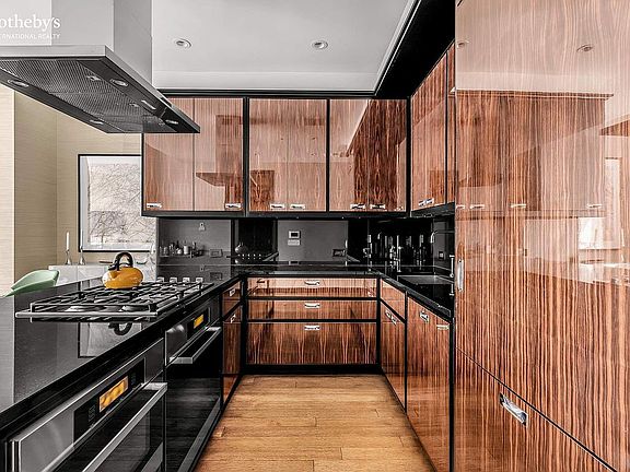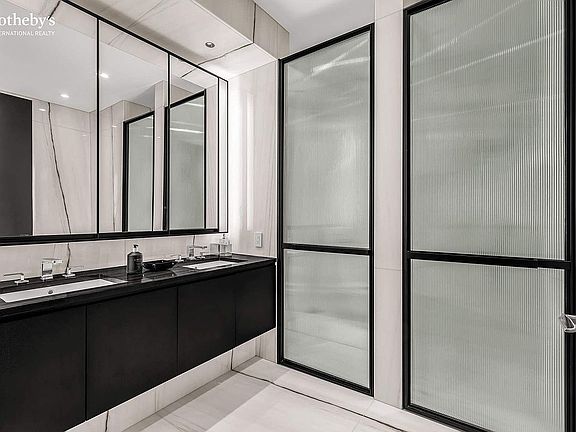 The south exposure offers excellent natural light and dramatic midtown views. Enjoy lofty11-foot ceilings and a generously proportioned living room with meticulously-crafted interior, solid rift-sawn oak floors and floor-to-ceiling windows. The generous open kitchen is designed by Smallbone of Devizes with rich Macassar Ebony cabinetry, complimented by Dornbracht fixtures and Miele appliances. The primary bedroom is enormous and offers three double closets as well as a magnificent five-piece ensuite marble bathroom with separate shower, jacuzzi bathtub and w/c.