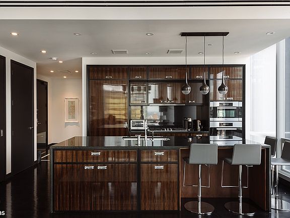 NO FEE. ONE57, iconic residential tower, designed by Pritzker-prize winning Architect Cristian de Portzamparc and interior by Danish designer Thomas Juul-Hansen. Spectacular 2,009 square foot south and west corner 2 Bedroom 2.5 bath home. The extraordinary light streams through the floor to ceiling windows throughout as well as dramatic views of the NYC skyline, the Hudson River and Central Park. A large foyer welcomes you to a dramatic grand salon with 11" ceilings and sweeping NYC skyline. The stunning kitchen is a dream: hand-crafted Smallbone of Devizes with premium cabinetry in Macassar, leather seating, Miele and Sub-Zero wine cooler, Dornbracht fittings and fixtures and expensive stone counters. The guest bathroom is in Onyx with beautiful fixtures. A most luxurious master bedroom suite with dressing room, a spa-like bathroom with double vanities, walk-in shower and soaking tub and ample closets. The well appointed second bedroom suite is in a separate wing. Oversized doors, large laundry and state of the art climate control system. The white glove and personal service is unparalleled. The rent includes First class amenities include 24 Hour Doorman and Concierge, fitness center and yoga studio, stunning indoor pool, private dining, full catering kitchen, library with billiards table, screening room and all Park Hyatt Hotel services and facilities. On-site parking garage, bike storage and cold storage is available and pets are allowed. Easy application process and flexible terms.