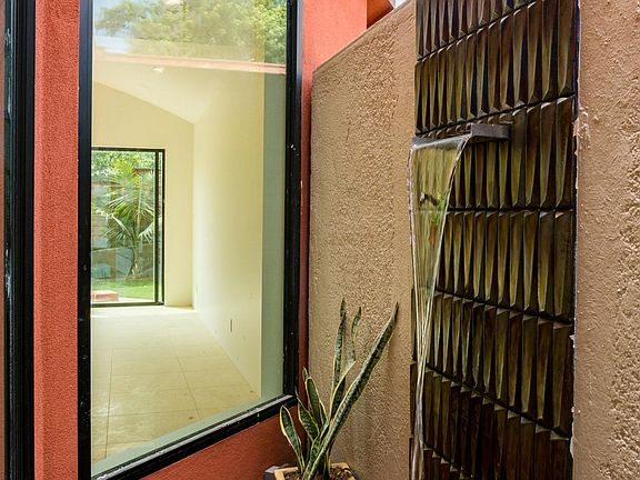 Modern gas fireplacePrivate gated backyardExterior waterfall featuresContemporary designCustom architectural featuresLimestone flooringOpen floor plan
