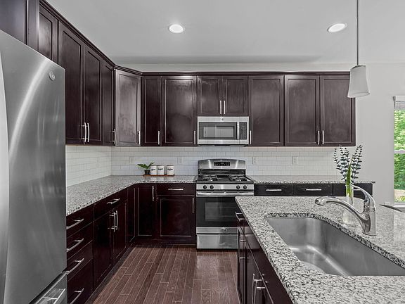 Located beside a cul-de-sac and backing to mature trees, this beautiful end-unit townhome offers both privacy and convenience in the desirable Woodcreek community. Step inside to find gleaming engineered hardwood-style flooring flowing from the entry through the main living areas, enhanced by a wall of windows along the side and rear that flood the space with natural light and serene wooded views. The open-concept layout features a stylish kitchen with rich espresso cabinetry, granite countertops, crisp white subway tile backsplash, gas range, and a large center island with breakfast bar seating, perfect for casual meals or entertaining. The adjacent dining area is light-filled and offers direct access to the private back patio through a large sliding door. The spacious family room accommodates multiple seating arrangements and is anchored by a cozy gas-log fireplace, creating an ideal setting to gather, relax, or host guests. Also on the main level are a powder room, walk-in pantry, and a generous storage closet. Upstairs, the private primary suite is positioned at the front of the home and features plush carpeting, a ceiling fan, and ample natural light. The ensuite bath impresses with a dual-sink granite vanity, step-in glass-enclosed shower, and a walk-in closet. Two additional bedrooms and a full hall bath are located at the rear of the home, with a centrally located laundry room and additional storage closet completing the upper level. Outdoor living is a breeze with both a covered front porch and a rear patio, perfect for dining, lounging, grilling, or adding a fire feature. A private locking storage room adds extra convenience. Living in The Townes at Woodcreek means low-maintenance living with exterior upkeep and landscaping handled for you. Enjoy top-tier community amenities including a clubhouse with fitness center, pool with lazy river and water slides, playgrounds, picnic areas, nature trails, and courts for basketball, tennis, and pickleball. Just one mile from the intersection of Sunset Lake and Holly Springs Roads as well as NC-540, you're minutes from a variety of shops, restaurants, parks, lakes, and entertainment in Holly Springs and the greater RTP area.